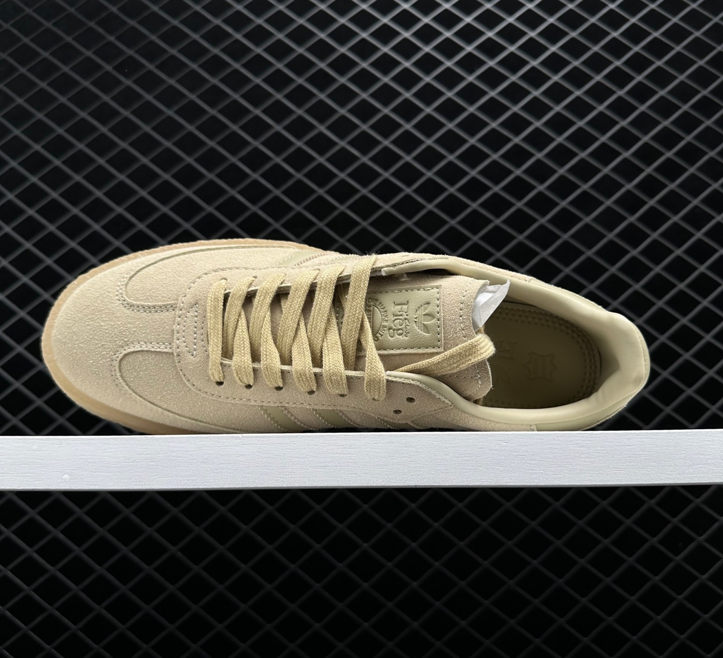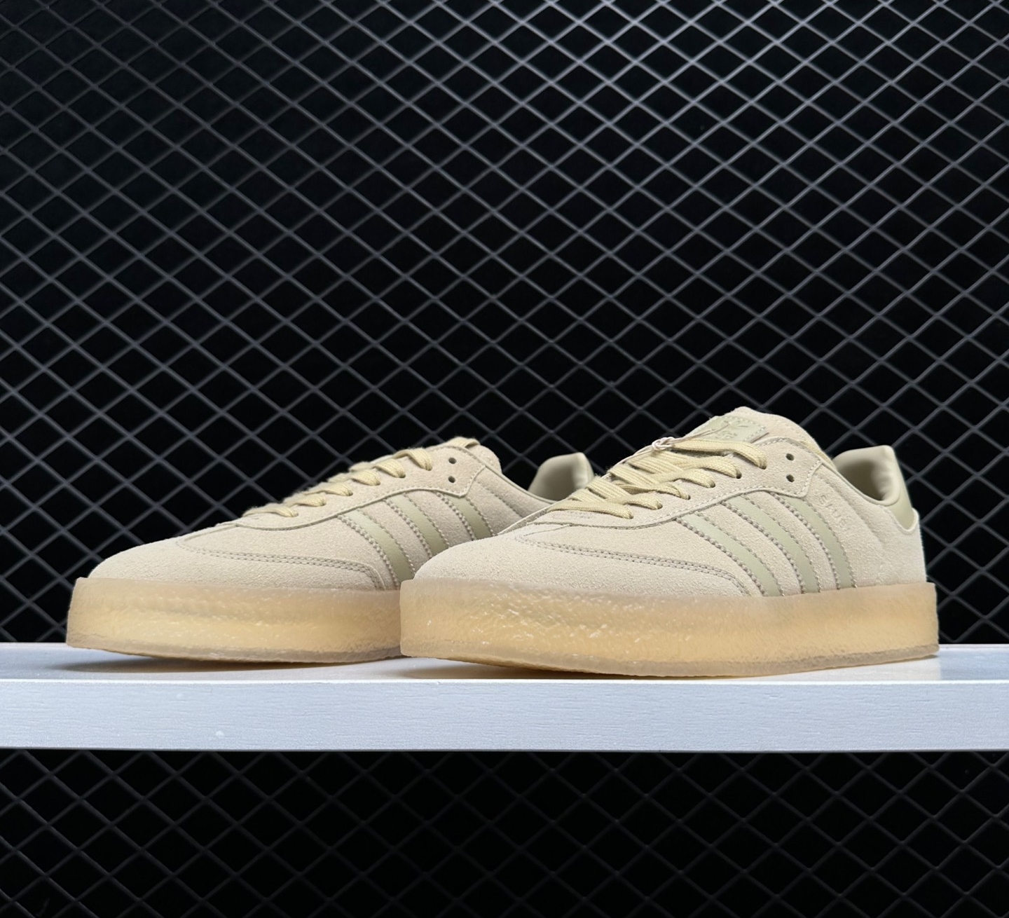 The Adidas Originals Ronnie Fieg X Clarks X Samba ‘Wheat’ ID7298 sneakers feature a lace-up closure for a secure and adjustable fit. The upper is constructed from high-quality suede material, ensuring longevity and style. The gum rubber outsole provides excellent traction and durability, making these sneakers suitable for various terrains. These sneakers are available in a range of sizes to ensure a perfect fit for every individual.