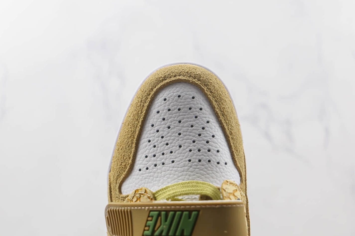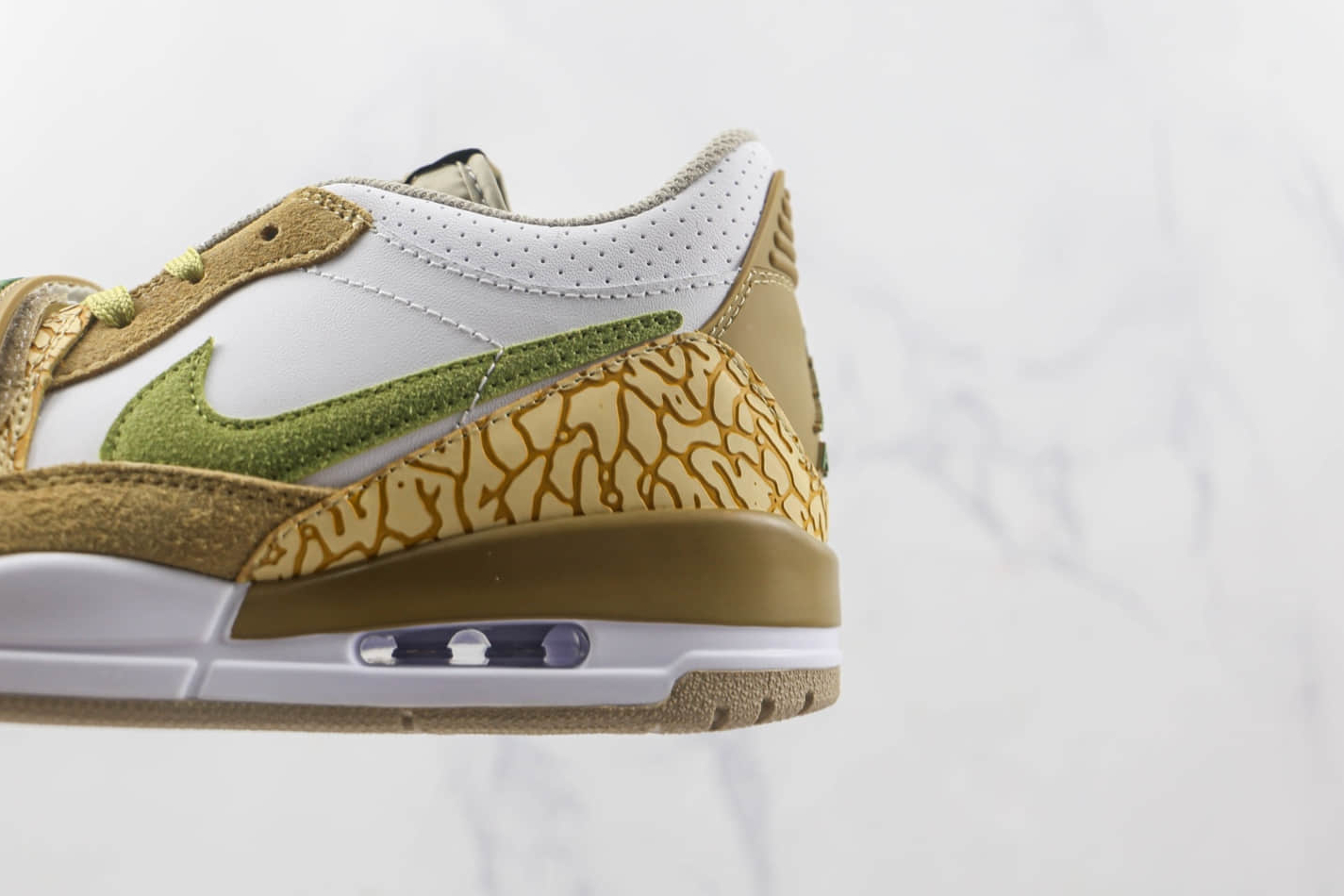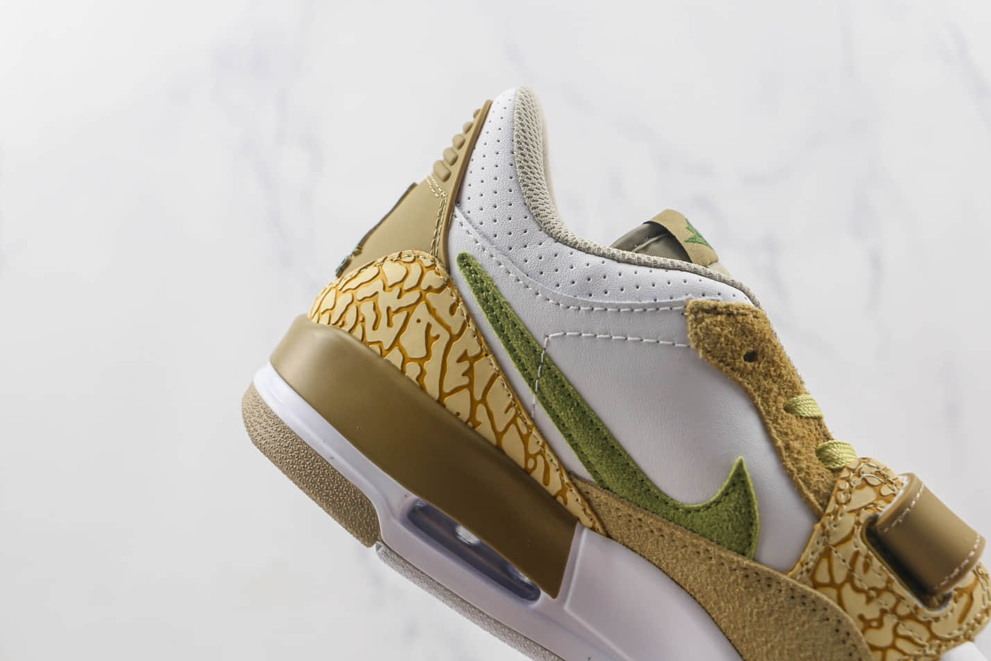 The Jordan Legacy 312 Low ‘Golden Moss Alligator’ DX9260-001 boasts a multitude of features that make it stand out from the crowd. The upper is constructed with a blend of genuine suede and premium leather, providing durability and a luxurious feel. The iconic Air Jordan 1 midfoot strap adds a touch of nostalgia and enhances lockdown support. The midsole combines Nike Air cushioning in the heel with a visible Air unit for exceptional comfort and impact protection. Additionally, the rubber outsole ensures reliable traction on various surfaces, making these sneakers suitable for both casual wear and athletic activities.