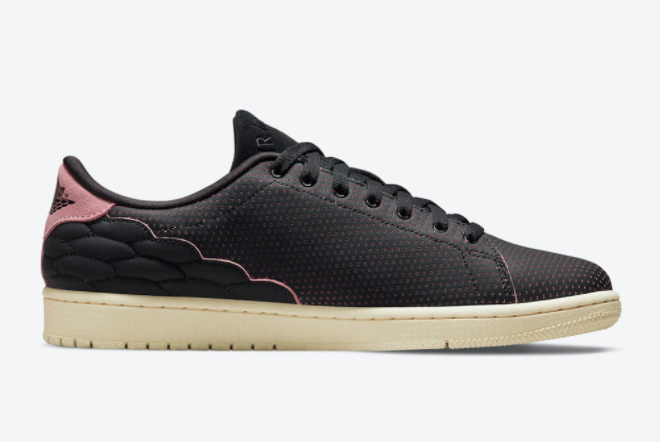 These Air Jordan 1 Centre Court sneakers boast a plethora of features that make them stand out from the crowd. The luxurious leather construction enhances durability and comfort, ensuring long-lasting wear while providing a plush feel. The black upper is contrasted with vibrant pink accents on the Nike Swoosh logo, heel tab, and Air Jordan branding, creating an eye-catching and fashionable design.